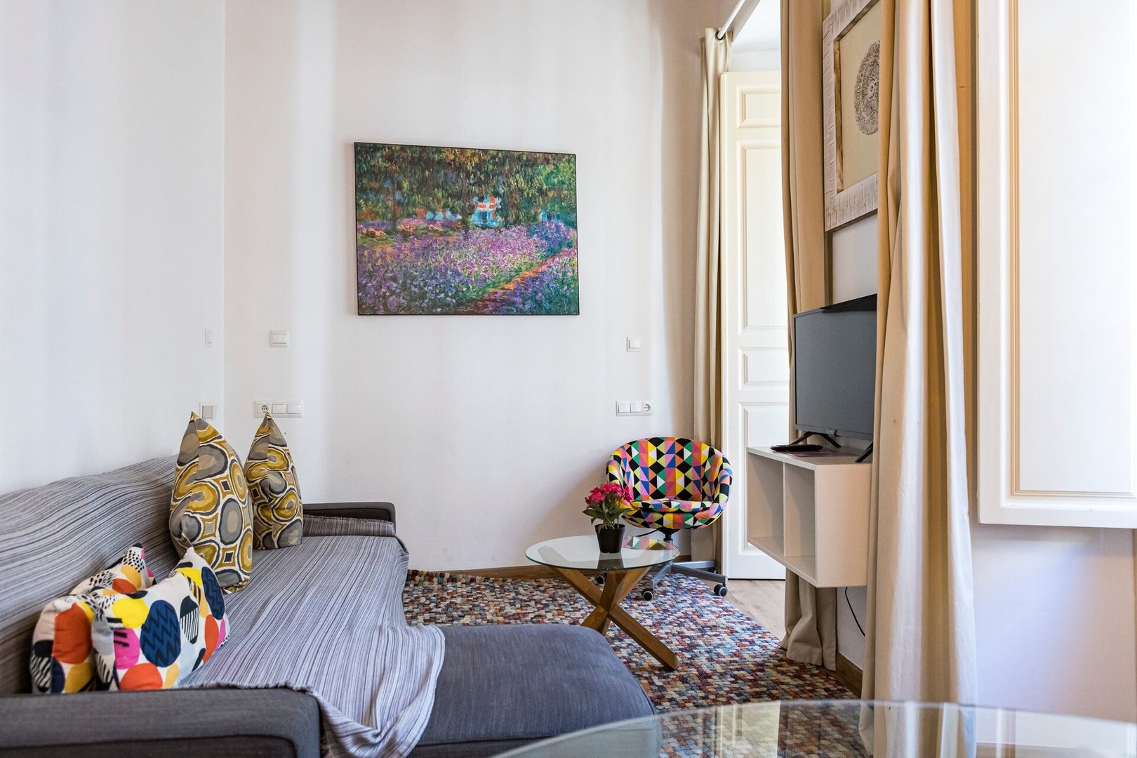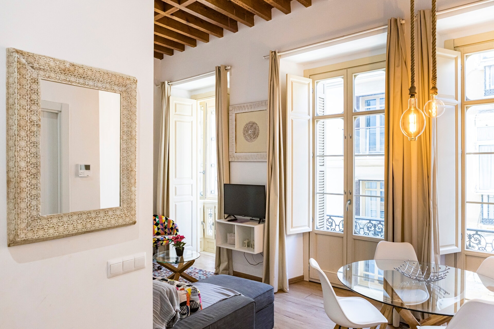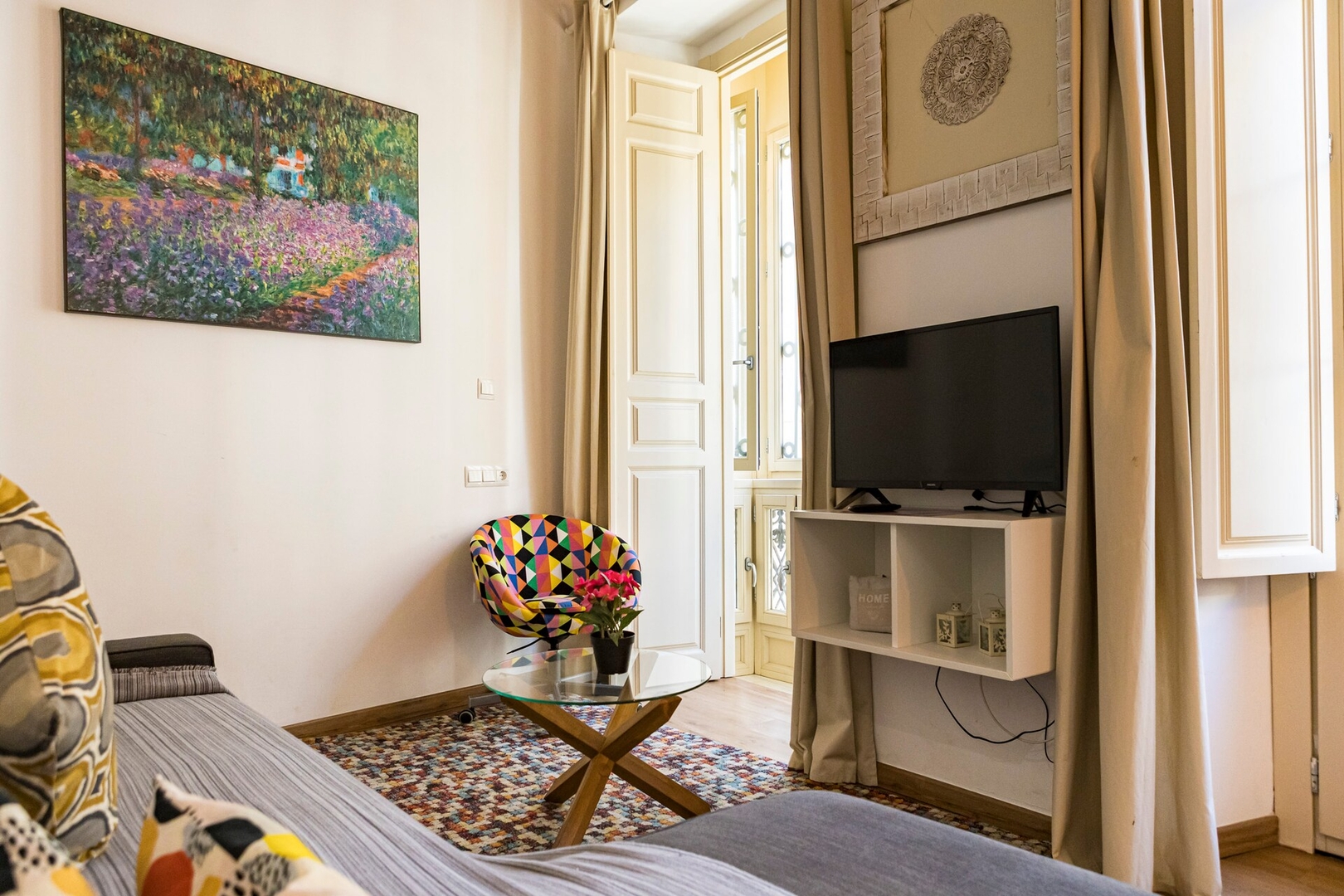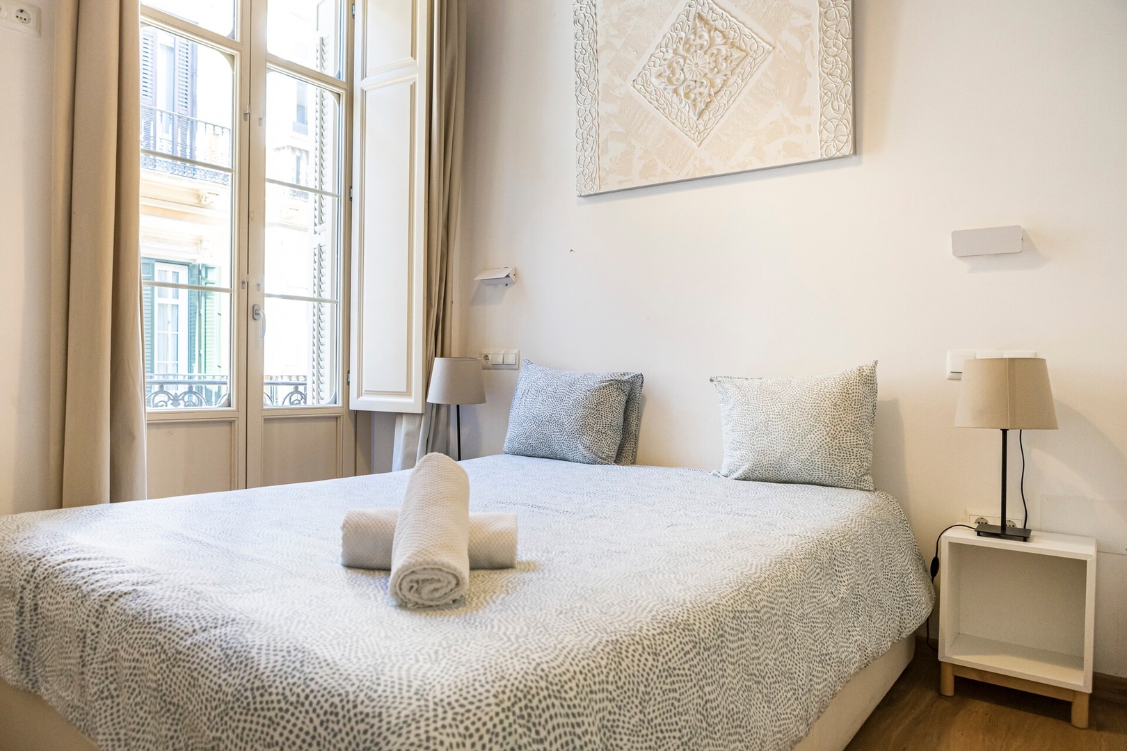 Este apartamento de 55 m² puede alojar cómodamente hasta 4 personas. Cuenta con un dormitorio con cama doble, un baño y una sala de estar con sofá cama para dos personas. Diseñado con esmero y totalmente equipado, es el lugar perfecto para relajarse después de explorar la ciudad y disfrutar de una cómoda estancia en Málaga.